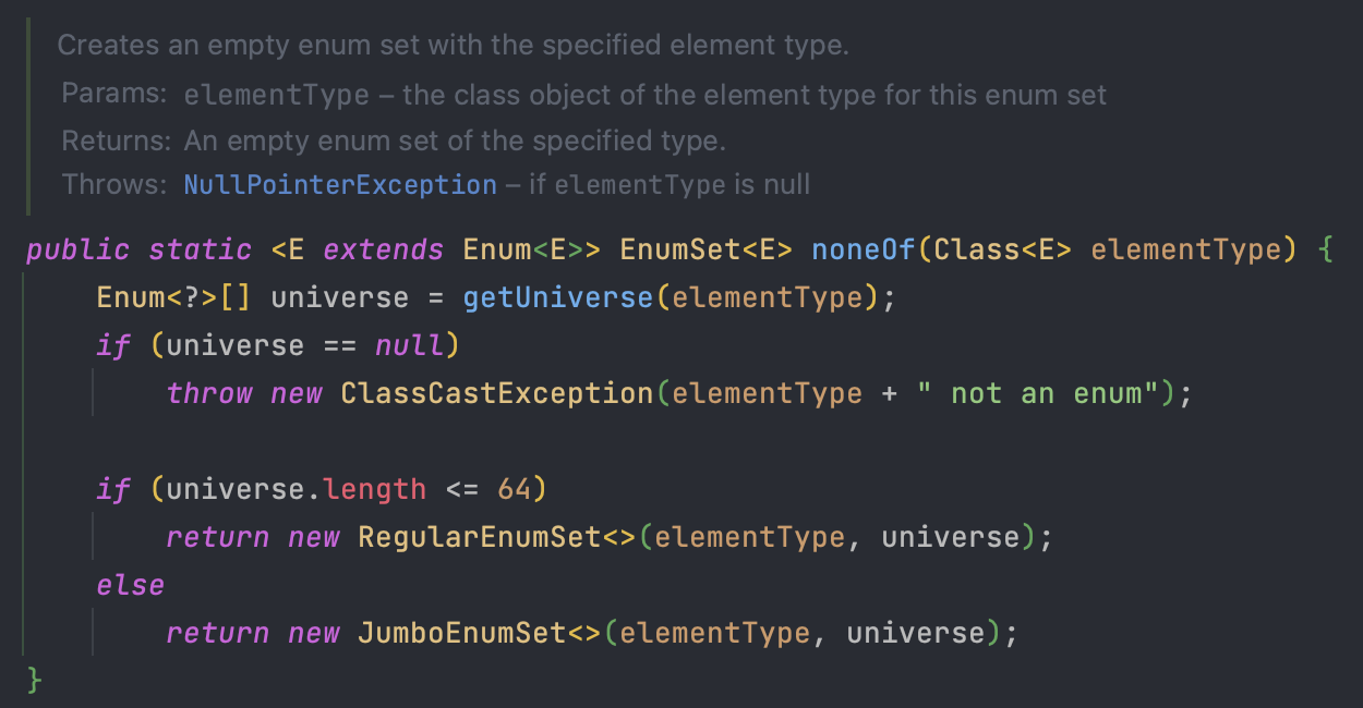 | of | 여러 매개변수를 받아 적합한 타입의 인스턴스를 반환하는 집계 메서드 | Set<Rank> faceCards = EnumSet.of(JACK, QUEEN, KING); |