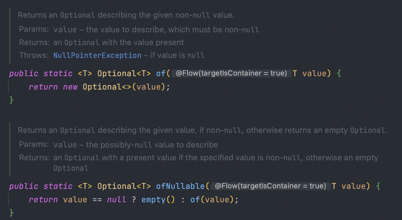 of() 메서드는 매개변수를 전달받아 새로운 객체를 생성해 반환해주고, ofNullable() 메서드는 nullable한 매개변수를 전달 받아 null이면 empty() 메서드를 통해 비어 있는 Optional 객체를 반환, 매개변수 값이 존재하면 of() 메서드를 호출하여 값이 저장된 Optional 객체를 반환한다. 이렇듯 메서드가 가진 이름을 통해 어떤 역할을 하는지 유추할 수 있고 그로 인해 의도와 맞지 않게 생성자를 사용하는 일도 방지할 수 있다.