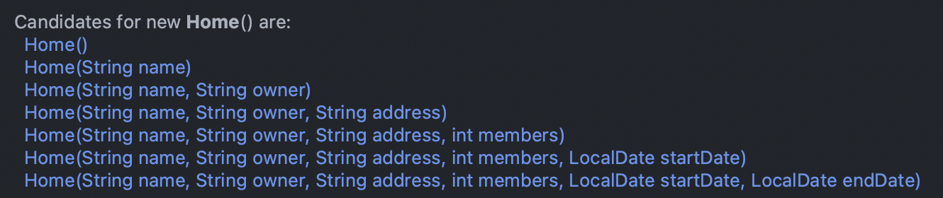 B 개발자는 Home 클래스의 생성자를 이용해 b를 위해 필요한 객체를 생성하려고 한다. 이때 다음과 같이 많은 생성자가 있다면 B 개발자는 이렇게 생각하지 않을까?