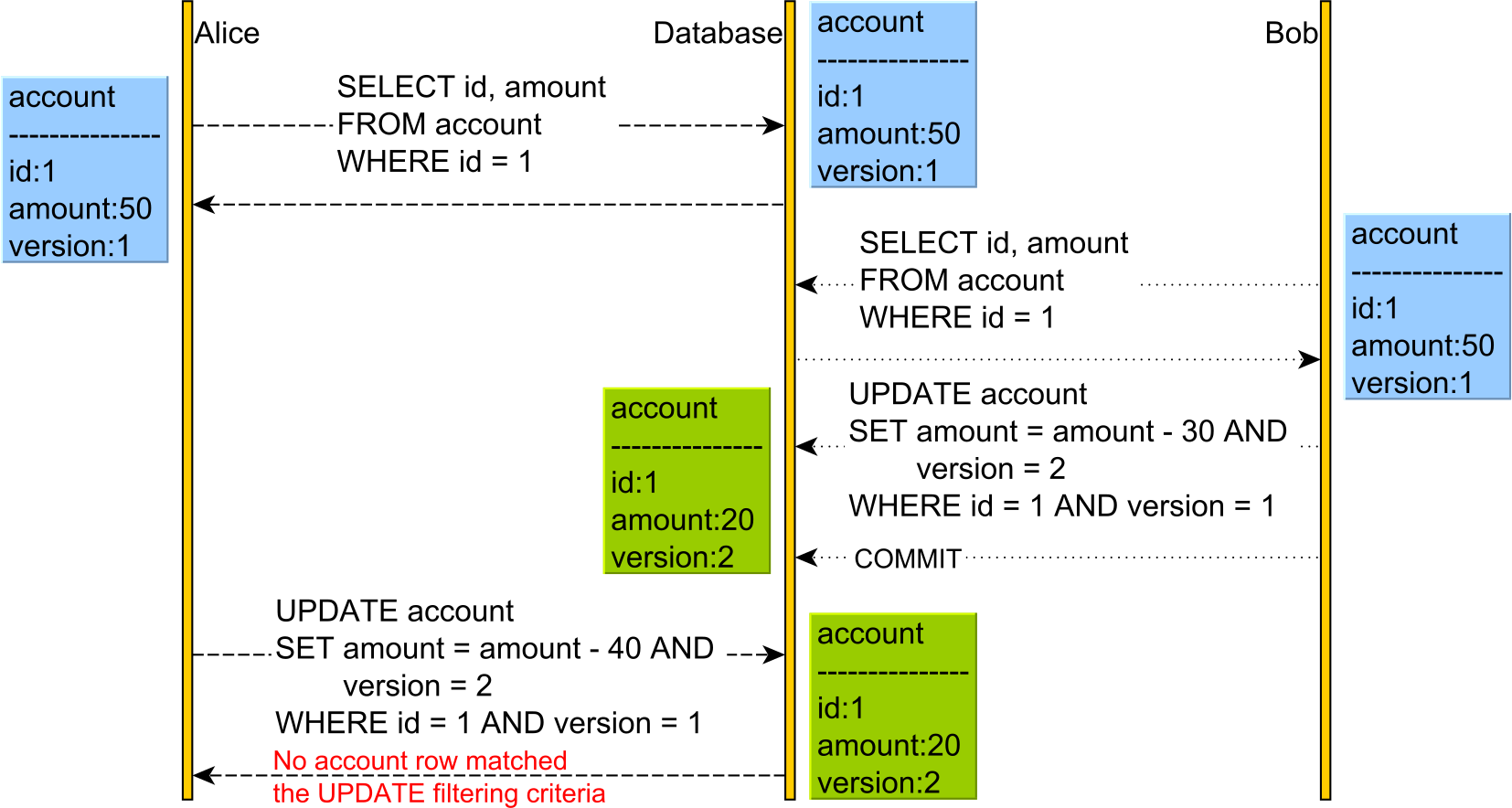 - 스냅샷 버전 정보가 일치하지 않아서 충돌이 발생하면 ROLLBACK을 하여 업데이트 손실을 방지한다.