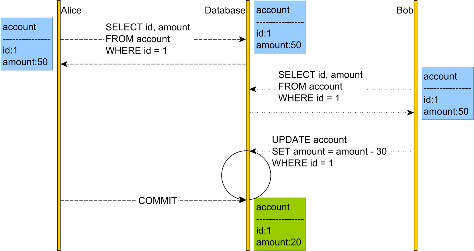 업무적으로 잘못된 데이터가 발생할 수 있다는 이야기는 뭘까? 만약 첫 번째 세션에서도 'ACC1' 계좌에서 잔액을 조회하고 4000원을 출금하려고 하고, 두 번째 세션에서도 'ACC1' 계좌의 잔액을 조회한 후에 똑같은 금액을 출금하려고 한다고 생각해보자. 참고로 'ACC1' 계좌의 잔액은 4000원이다.