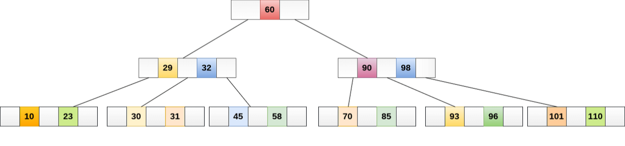 그리고 각 노드에 최소한의 키가 있게 해서 균형을 유지하는데 트리의 초기 모양에 상관없이 각 작업의 시간 복잡도를 항상 O(longN)로 보장할 수 있다. 데이터 양이 증가한다고 해도 검색 속도가 갑자기 악화되지 않도록 하는 것이다.