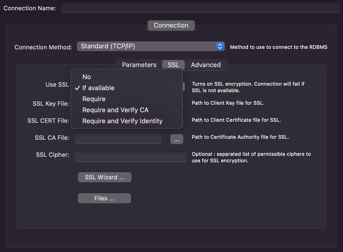MySQL의 SSL 설정이 true로 되어있기 때문에 유효하지 않은 패킷이라고 인식된 것이다. 워크벤치에서도 SSL 설정 값이 Require으로 설정되어있다면 아마 연결할 수 없었을 것이다. 기본으로 설정된 값은 If available이다.