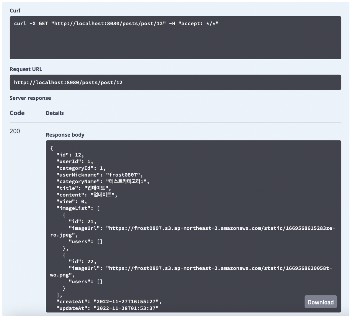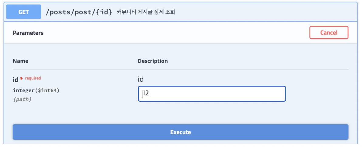 버튼을 누르고 파라미터를 입력하면 응답 객체를 확인할 수 있다.