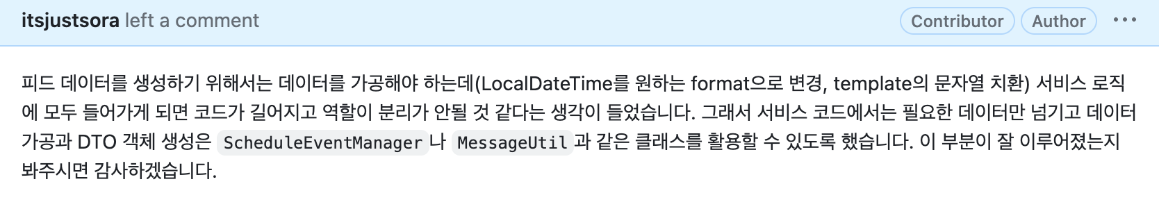 - 이전에는 ScheduleEventDto 객체를 미리 생성하고 전달했지만 이제는 정보를 모두 전달 받아 보낼 때 객체를 생성한다. 해당 메시지를 보내는 주체에게 객체 생성의 책임을 위임한 것이다. (멘토님이 말씀하시는 핵심 리팩토링 부분 ⭐️)