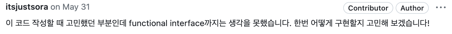 더불어서 멘토님이 말씀하신 Functional Inteface 활용 의도와 맞고 책임과 관심사가 제대로 분리된 코드를 직접 보여주시고 설명해 주셔서 이번에 내가 놓친 게 뭐였는지 정확하게 파악할 수 있었다.