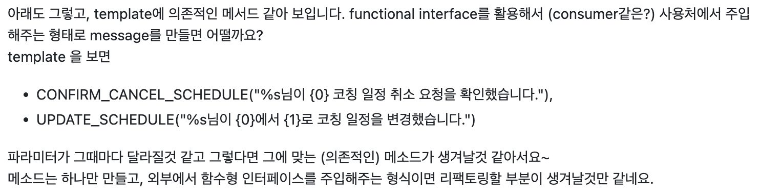 이벤트가 발생했을 때 메시지가 발송되는 것이기 때문에 문자열을 치환하여 메시지를 만드는 것은 메시지를 발송하는 측의 관심사라고 보고 코드를 개선했다. 이렇게 하다 보니 확연히 코드의 수가 줄고 관심사를 제대로 분리할 수 있었다.