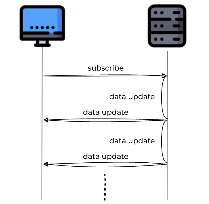 - 먼저 클라이언트에서 서버로 업데이트 된 데이터를 받을 수 있도록 요청(구독)한다.