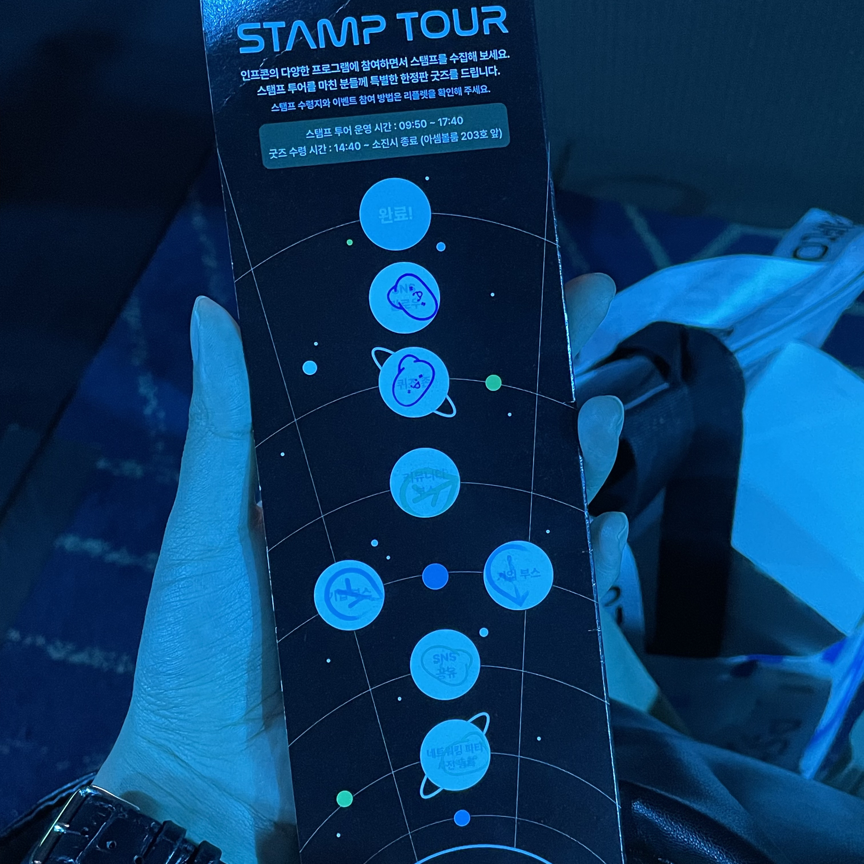 이름표와 팜플렛, 인프콘 가방 그리고 생수를 받아 입장한 인프콘! 팜플렛에는 스탬프 투어 페이지가 있어서 인프콘에서 어떤 프로그램에 참여할 수 있는지 한 눈에 확인할 수 있었는데 다 참여해서 굿즈는 꼭 받아가리라 다짐했다,, 언제 또 올 수 있을지 모르니까 🥲 그리고 돌아다니면서 느낀 건데 팜플렛에 스탬프 투어가 있어서 그런지 이벤트에 참여하시는 분들이 많아서 다들 혼자 오셔도 자연스럽게 참여하게 되는 분위기였다. 네트워킹하는 장소에 참여자들 이름을 새긴 화면이 있었는데 그때는 발견 못했지만 사진 올리면서 내 이름을 발견했다 💚