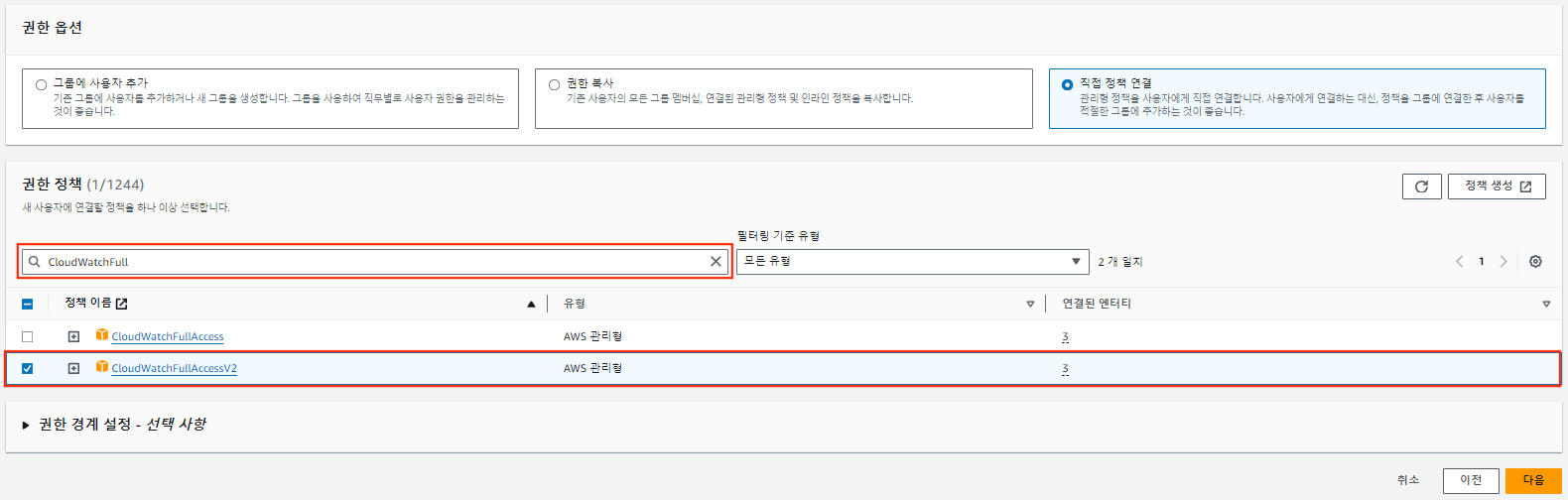 2️⃣ 권한 정책은 CloudWatchFullAccessV2를 선택한다.