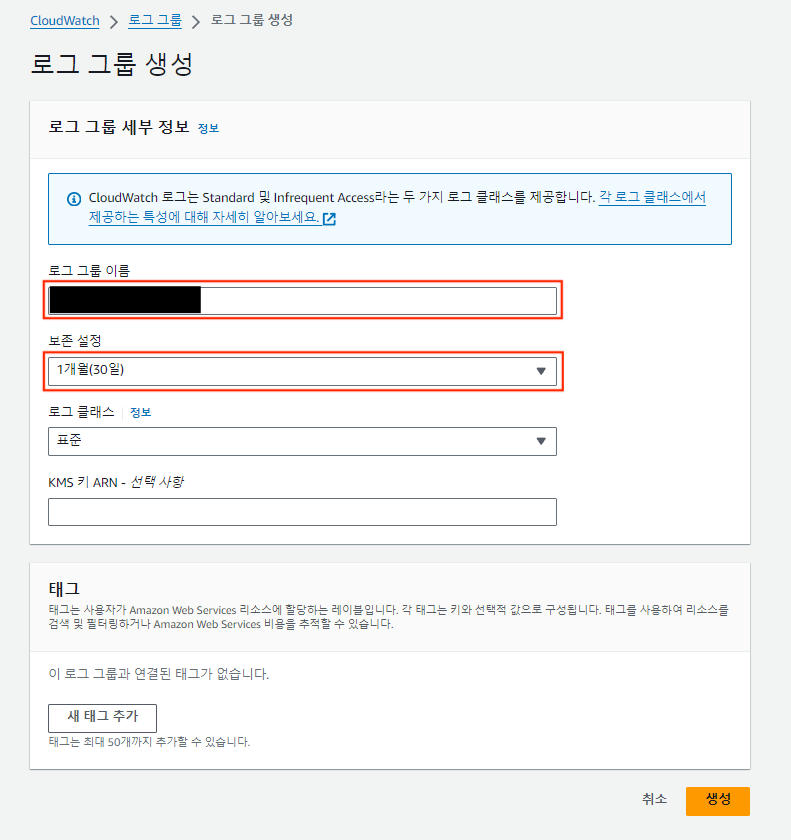 CloudWatch > 로그 그룹을 통해 이름과 보존 기간을 설정하여 로그 그룹을 생성한다.