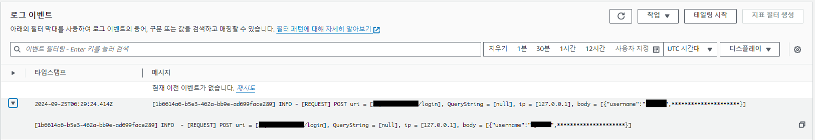 첫 요청과 응답이 발생하면 몇 초 이내로 아래와 같은 로그가 뜨는 것을 확인할 수 있다. 그 이후에 CloudWatch에 적재된 로그를 확인하자.