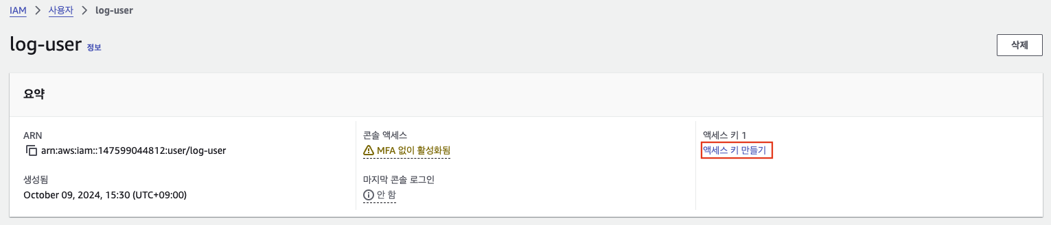 3️⃣ 생성된 사용자를 클릭해 액세스 키를 만든다. 여기에서 만들어진 Access key Id와 Secret Access Key 정보를 통해 CloudWatch에 접근할 수 있으니 저장해 놓자.
