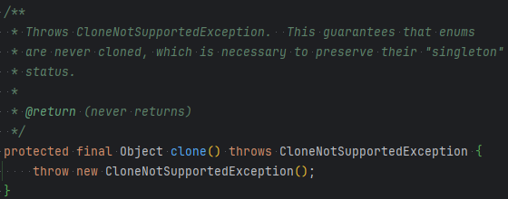 - Enum의 final clone 메서드는 열거형 상수가 절대로 복제(clone)될 수 없도록 합니다.