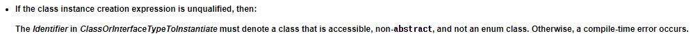 열거형 클래스의 인스턴스는 열거형 상수로 정의된 것 외에는 존재하지 않습니다. 열거형 클래스를 명시적으로 인스턴스화하려고 시도하면 컴파일 시 오류가 발생합니다 (§15.9.1).컴파일 오류 외에도 열거형 클래스 인스턴스가 열거형 상수 외에 존재하지 않도록 보장하는 세 가지 추가 메커니즘이 있습니다.