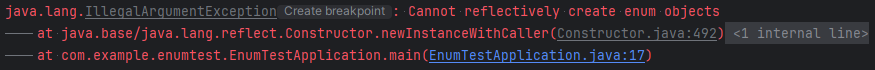 바로 리플렉션을 활용해서 Enum 클래스를 인스턴스화할 수 없다는 메시지와 함께 IllegalArgumentException이 발생한다. 그러니까 내부적으로 이미 인스턴스화 자체에 철벽을 쳐놓은 셈이다.