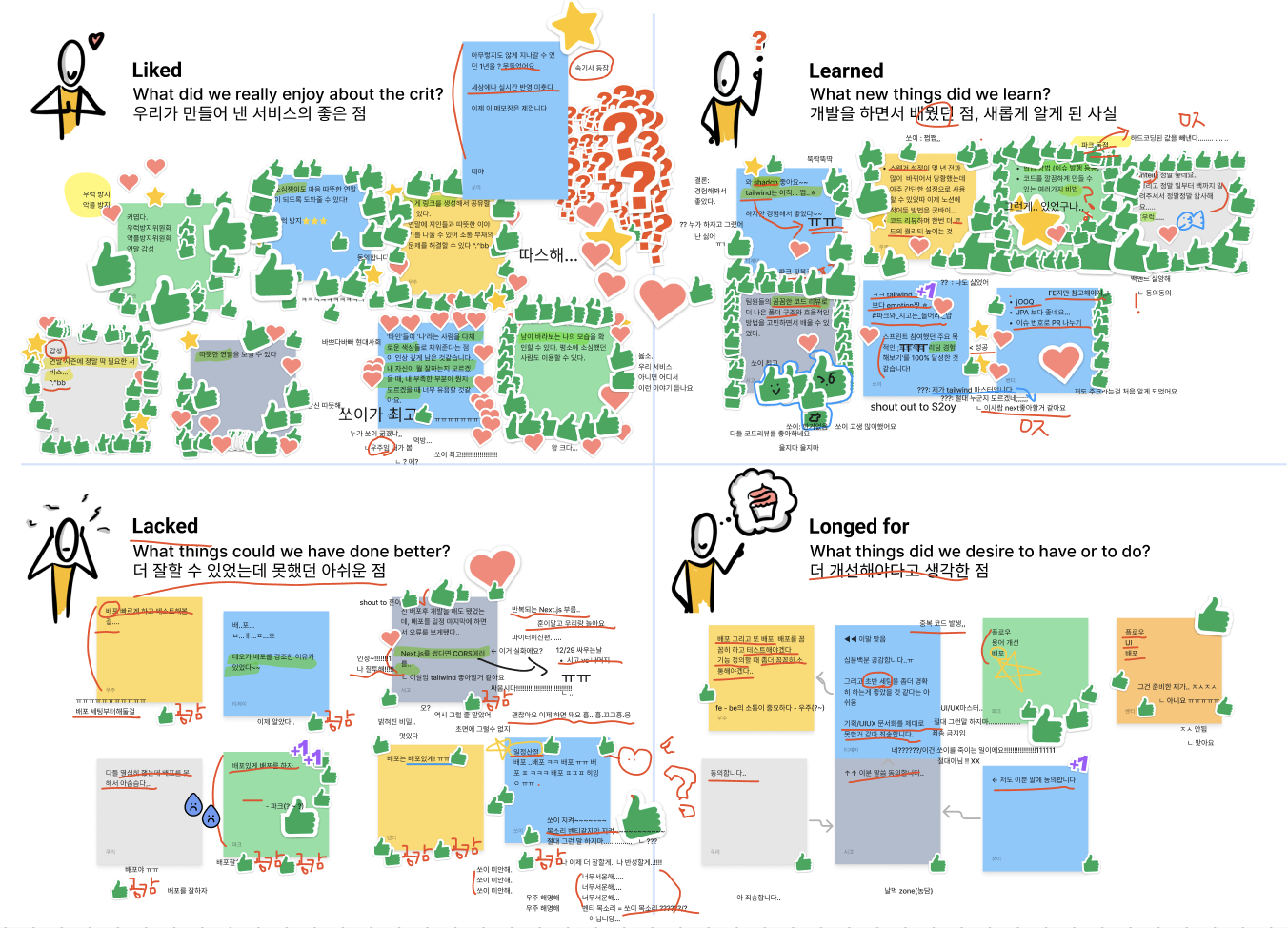 모든 세션이 끝난 뒤에 테오의 스프린트의 마지막 단계로 팀끼리 모여 회고를 했다. 모두가 배포에 대해 아쉬움을 드러냈다 ߹ - ߹ 그리고 우리 모두 이 프로젝트를 마무리 시키고 싶다는 의견에 동의했다.