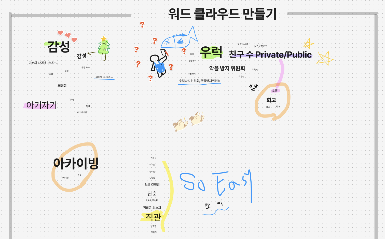 우리는 이날 서비스의 목적, 타겟, 핵심 가치들에 대해 이야기를 나누면서 우리 서비스의 키워드들은 무엇일까를 고민하며 서로의 생각을 이야기했다. 그리고 어떻게 하면 이 키워드들을 서비스에서 잘 구현해 낼 수 있을지를 같이 고민하며 시간을 보냈다.