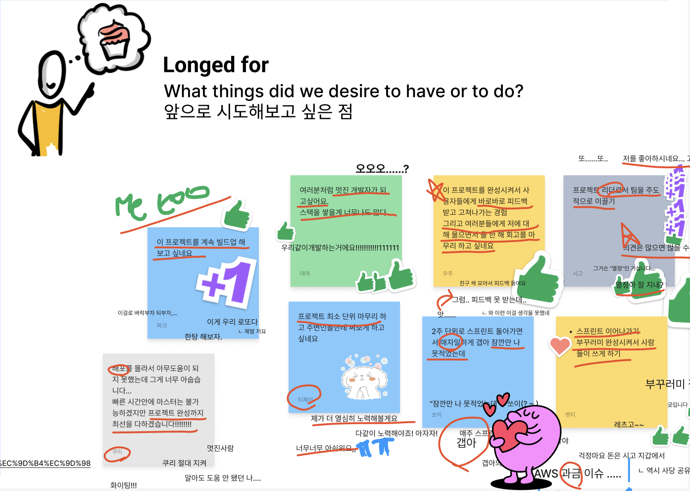 지연됐던 디자인 작업도 너무나도 귀여운 캐릭터로 척척 진행되고(너무 귀여워) 백엔드, 프론트엔드 모두 각자 업무를 맡아 열심히 요청사항도 반영하고 버그를 고쳐나가고 있어서 지금은 테스트를 진행하는 단계에 도달했다. 프로젝트를 완성해 나가는 뿌듯함도 있지만 결국에 남는 것은 사람인 것 같아서 좋은 사람들을 알게된 게 감사하고 행복하다 ( ˘ᴗ˘ ) 그리고 알고보니 같이 작업했던 백엔드 팀원 중 한 명이 글또였다! 역시 글또는 좋은 사람들로 가득해!