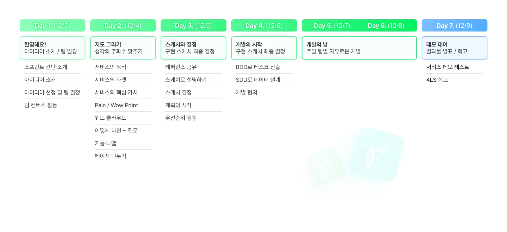 총 7일로 팀 빌딩부터 시작해 마지막 일정인 데모 데이로 끝이 나는 일정이다.