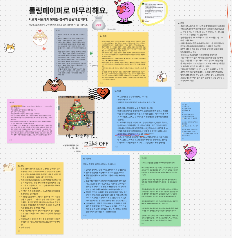 그리고 정말 마지막으로 서로에게 롤링페이퍼를 남겼다. 모두 인사를 하고 돌아가고도 롤링페이퍼를 한참 읽었는데 읽을수록 기분이 뭉클했다. 어쩌면 지나칠 수 있었던 인연들을 소중한 기회로 잘 만나 덕분에 일주일을 잘 보냈다는 뿌듯함이 생긴 시간이었다.