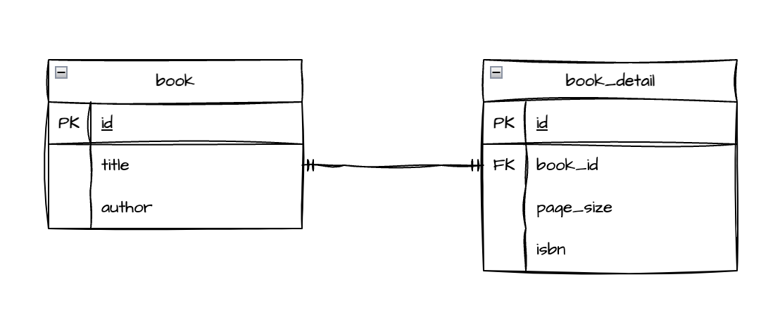 간단하게 일대일 관계를 가진 book 테이블과 book_detail 테이블을 통해 jOOQ의 매핑 방법을 설명해 보려고 한다. JPA의 매핑 방식과 비교하면 더 이해하기 쉽기 때문에 JPA부터 어떻게 처리하는지 알아보자.