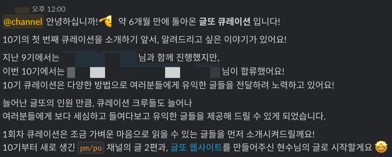 글또에는 큐레이션 시스템이 있어서 크루들이 여러 글을 읽고 다양한 관점으로 글을 선정해서 채널에 보내준다. 인사이트를 얻을 수 있는 회고 글부터 시작해서 취업 및 이직과 관련된 정보 글 혹은 기술을 깊게 분석하고 소개하는 글 등 다양한 글이 올라오는데 보다 보면 "세상에 글을 잘 쓰는 사람이 이렇게나 많다고?" "이 개념을 이렇게 이해하기 쉽게 설명할 수 있다고?" 하고 놀라고는 한다. 그렇기 때문에 큐레이션 선정까지는 큰 기대가 없었다. 글을 제출할 때마다 큐레이션을 요청하면 10포인트를 더 주기 때문에 은근슬쩍 계속 요청을 하게 되기는 했지만 말이다(포인트는 놓치기 싫다구).