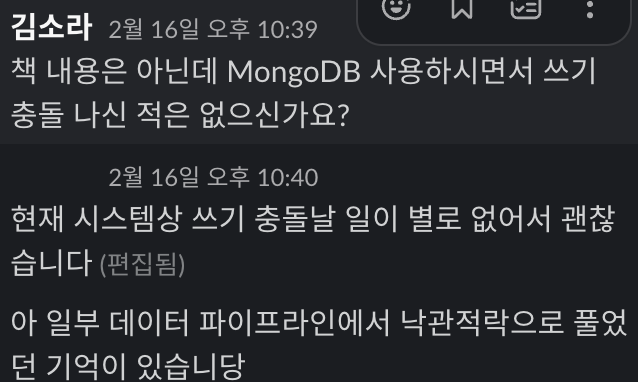 2월 9일에 시작해 끝을 향해 달려가고 있는 <데이터 중심 애플리케이션 설계> 스터디이다. 백엔드 개발자, 프론트엔드 개발자, 데이터 분석가가 모여 매주 일요일 10시에 허들로 발표를 하고 서로 질문하는 시간을 가진다.