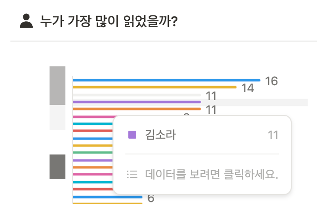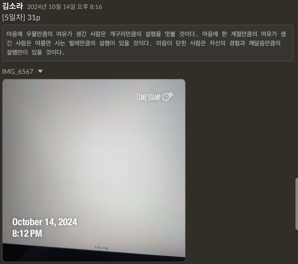 여러 소모임에 소속은 되어있지만 크게 활동을 하진 않았는데 유일하게 참여를 많이 했던 채널이다. 마음의 여유가 없을 때가 많았어서 생각보다 많은 기록을 남기지 못했지만, 이 소모임을 통해서 독서의 재미를 더 느끼게 됐다. 매일 올라오는 독서 인증 댓글에서 좋은 문장들을 발견하기도 하고 같은 책을 읽으시는 분들이 나와 다른 문장들을 고르면 신기하기도 하고 좋았던 경험이었다.