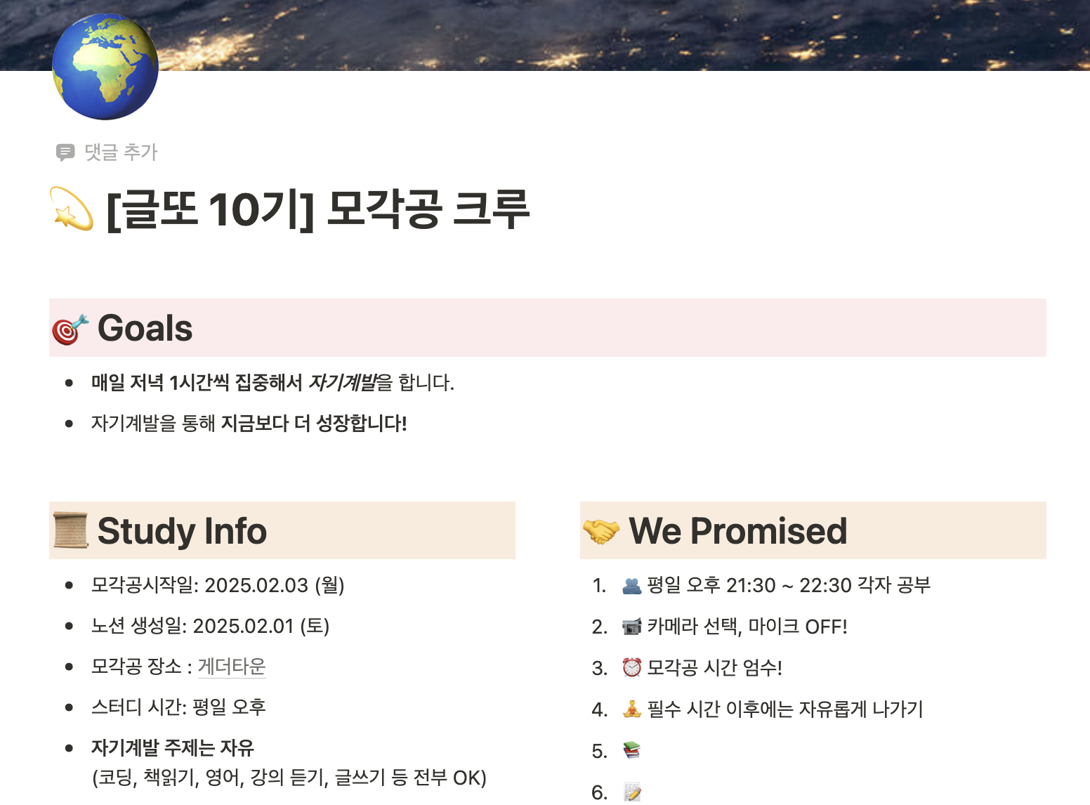 아는 사람만 알 수 있게 비공개 채널로 운영됐던 모각공 크루는 평일에 게더타운에 모여 각자 1시간 이상 자유롭게 자기 계발을 하는 소모임이다. 점점 시간이 지나면서 참여 인원이 적어졌지만, 그래도 나에게는 나태해지는 날에 꾸역 꾸역이라도 자리에 앉게 해주는 고마운 채널이었다. 글또 10기를 시작할 때, 모각코도 해보고 싶다고 했었는데 모각"코"까지는 아니지만 같이 공부할 수 있는 시간을 마련해 주셔서 감사하다.
