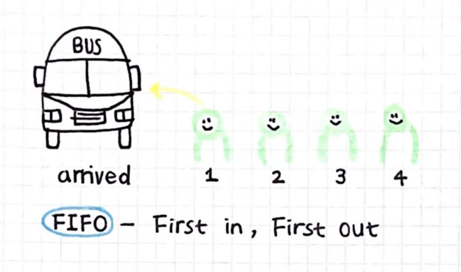 스택과 마찬가지로 메모리 안 데이터들을 더욱 효율적으로 다루기 위해 만들어진 데이터 참조 방식으로 스택과는 반대로 가장 먼저 들어온 데이터가 먼저 나가는 구조(FIFO, First In First Out)를 가진 자료구조이다. 버스 정류장에서 버스를 타기 위해 줄을 서면 먼저 온 사람이 먼저 버스를 타는 과정을 생각하면 된다.