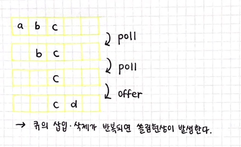 Array로 큐를 구현하면 위의 그림과 같이 쏠림 현상이 발생하는데 인덱스를 계속 해서 앞으로 당기거나 뒤로 밀면 비효율적이고 이 상태에서 배열 크기를 늘리면 빈 공간을 그대로 두고 계속해서 배열 크기만 커지기 때문에 메모리를 낭비하게 된다. 그렇다면 어떻게 이 문제를 어떻게 해결해야 할까?