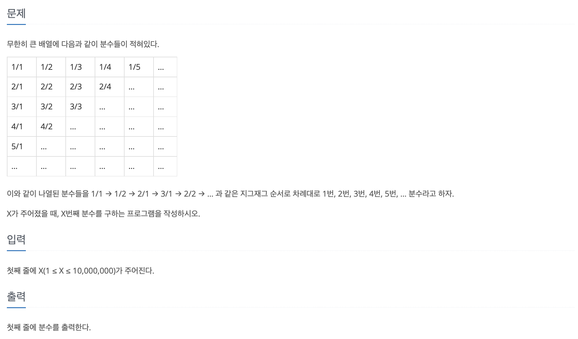 세 번째 대각선 행을 보면 홀수 행이고 대각선 위 방향으로 진행이기 때문에 3/1 -> 2/2 -> 1/3 이 된다. 분자는 3에서 1로 감소 되고 분모는 1에서 3으로 증가하는 걸 알 수 있다.