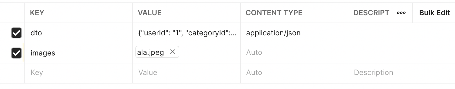 Content-Type이 각각 다른 것을 알 수 있다. dto는 application/json의 형식이고 MultipartFile 리스트 값을 받는 Images는 multipart/form-data형식으로 데이터를 받는다.