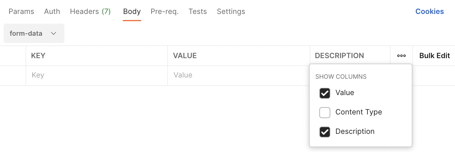 이때 Postman에서 데이터를 보내려면 [Body] 탭의 form-data 형식을 선택해서 두 번째 사진처럼 해당 값을 입력하면 된다.